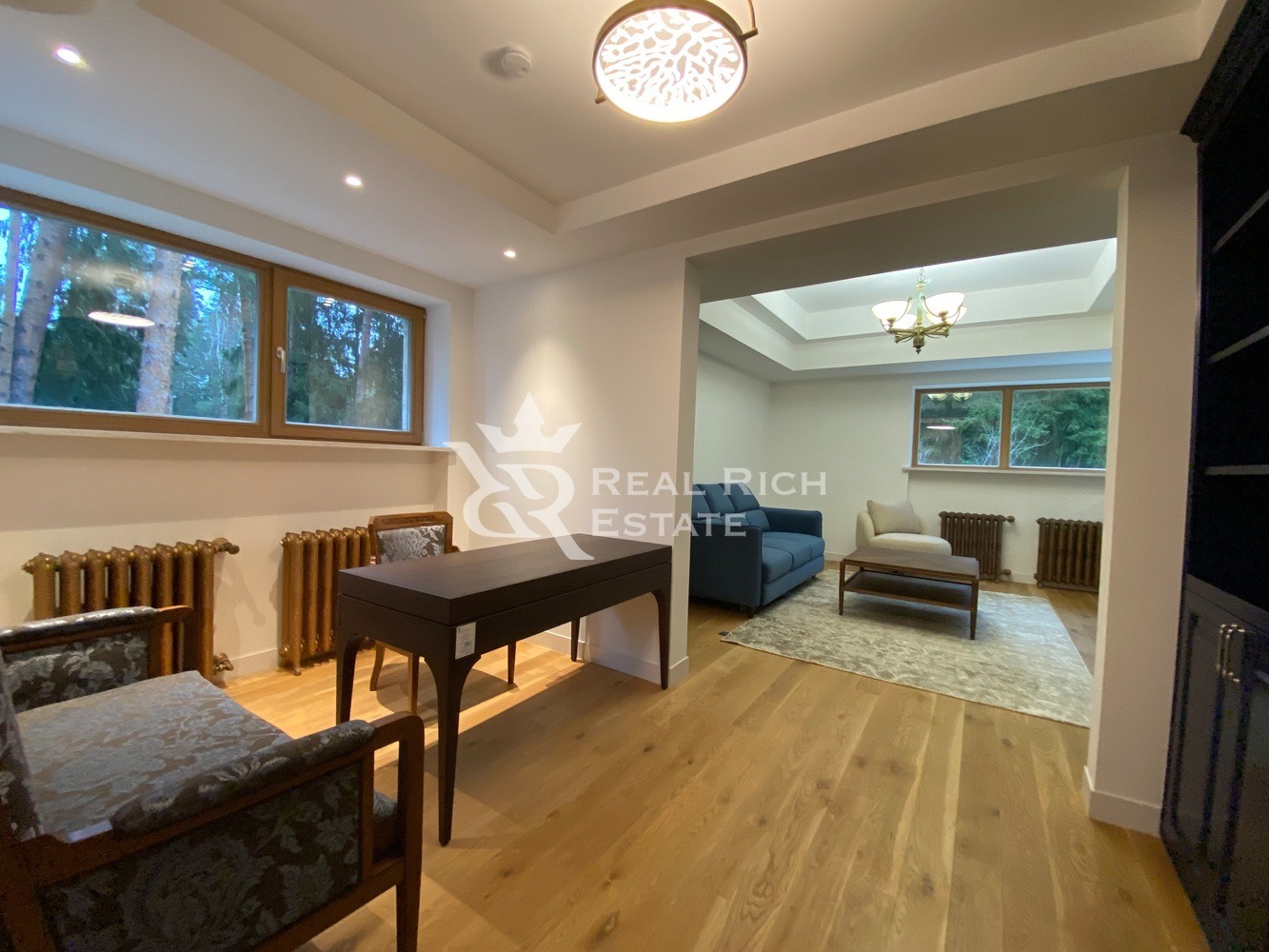 1 этаж: кабинет с камином и санузлом, спальня с санузлом, кухня, панорамная столовая, 2 зоны гостиной с двусторонним камином.